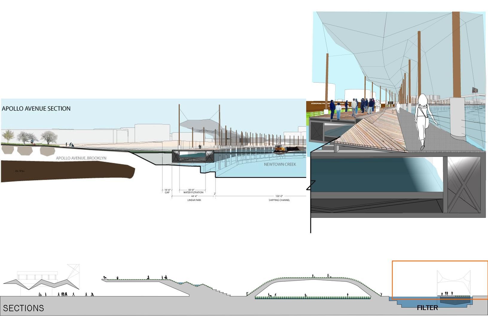 Envisioned as a self-sufficient public space, power will be provided via solar fabric canopies, maintenance funding will be generated through public-private partnerships to provide kayaking, entertainment space and academic space. The waterfront public space enables additional development near Greenpoint, recently up-zoned for residential development.